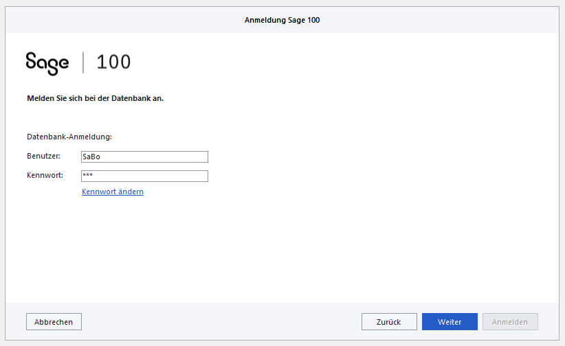 Hier muss man statt auf "Anmelden" auf "Weiter" klicken. Die gewünschte Datenbank wird ausgewählt (meist vorausgewählt), und im folgenden Dialog wird der eigene Benutzer eingegeben:
