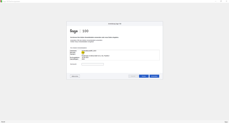 Durch Klicken auf "Weiter" durchläuft man die Mandantenauswahl und zum Schluss durch Klicken auf "Anmeldung" erzeugt man den Start der Applikation.
