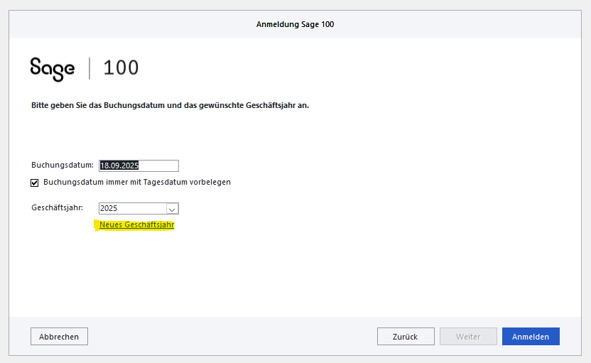 Legen Sie das neue Geschäftsjahr bei der Anmeldung über „Neues Geschäftsjahr“