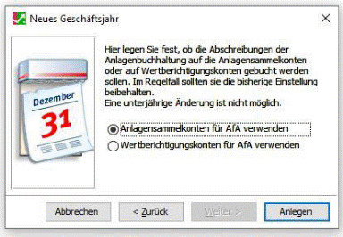 Sie dann die Abschreibung der Anlagenbuchhaltung fest (Anlagesammel- oder Wertberichtigungskonten) für AfA.