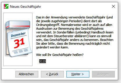 ! Alle getroffenen Einstellungen bei der Anlage des neuen Geschäftsjahres