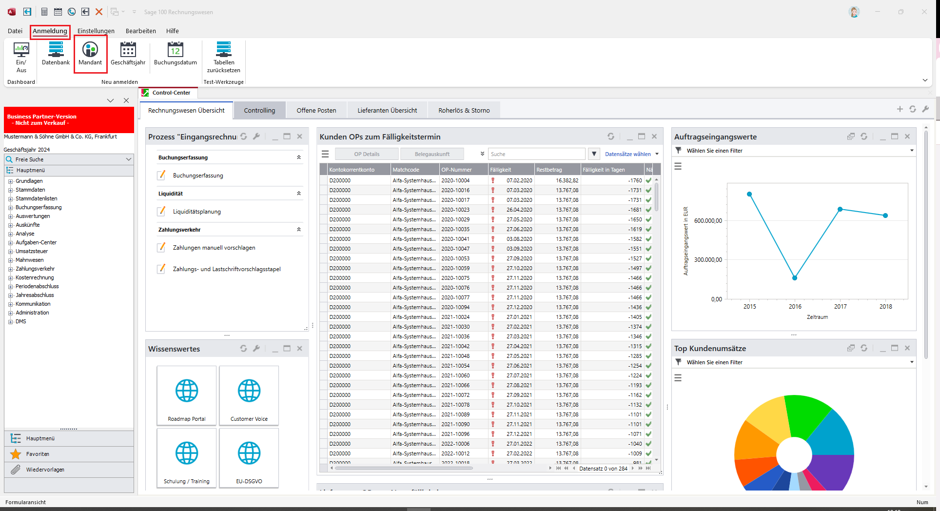 Sind mehrere Mandanten in einem System und einer Datenbank vorhanden, lässt sich der Mandant über den Punkt "Anmeldung" und "Mandant" wechseln: